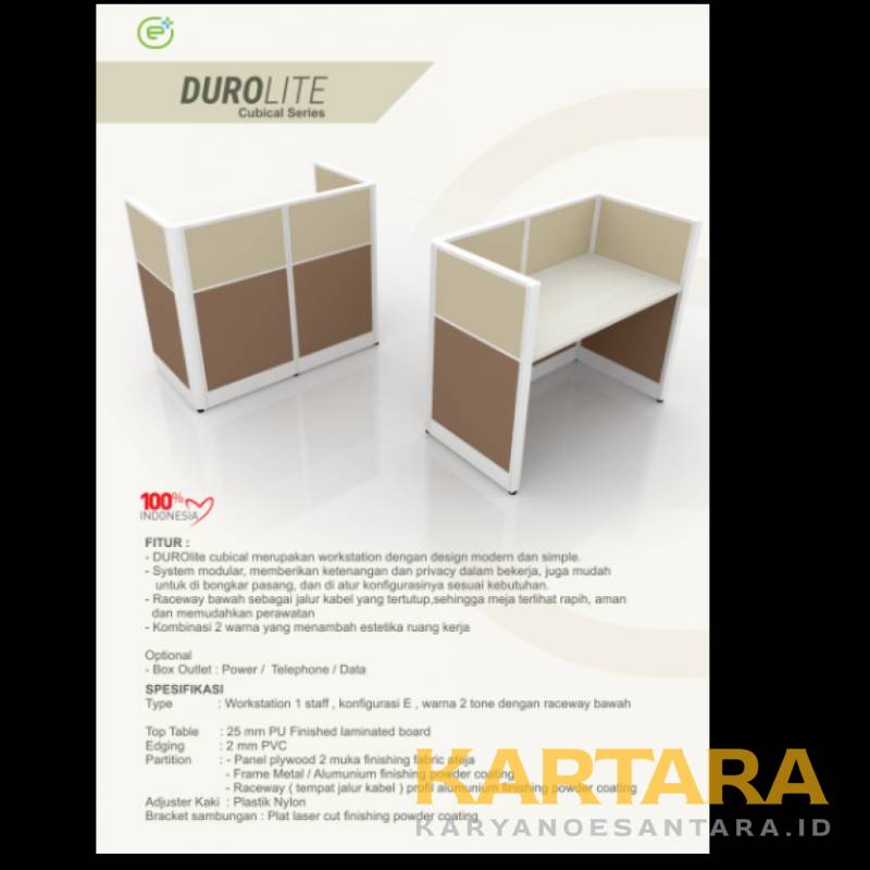 Spesifikasi : Particle Board 25 mm 2mk (MFC), PVC Edging 2 mm, Alumunium Top Chanel, Alumunium Kaki Raceway, Alumunium Tutup Raceway, Alumunium Vertikal, Alumunium Horizontal, Plywood 3 mm, Alabama Fabric, Coating, Adjuster Kaki Enduro, Endcap Siku, Styrofoam, dan Bracket Partisi B-120 Enduro. Garansi resmi sampai dengan 5 tahun.